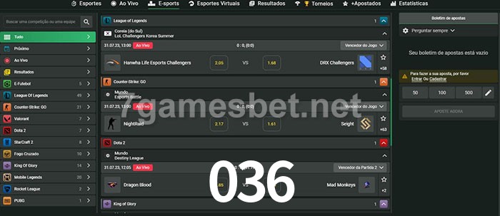 O 036 oferece uma grande seleção de opções de apostas em e-sports com probabilidades competitivas